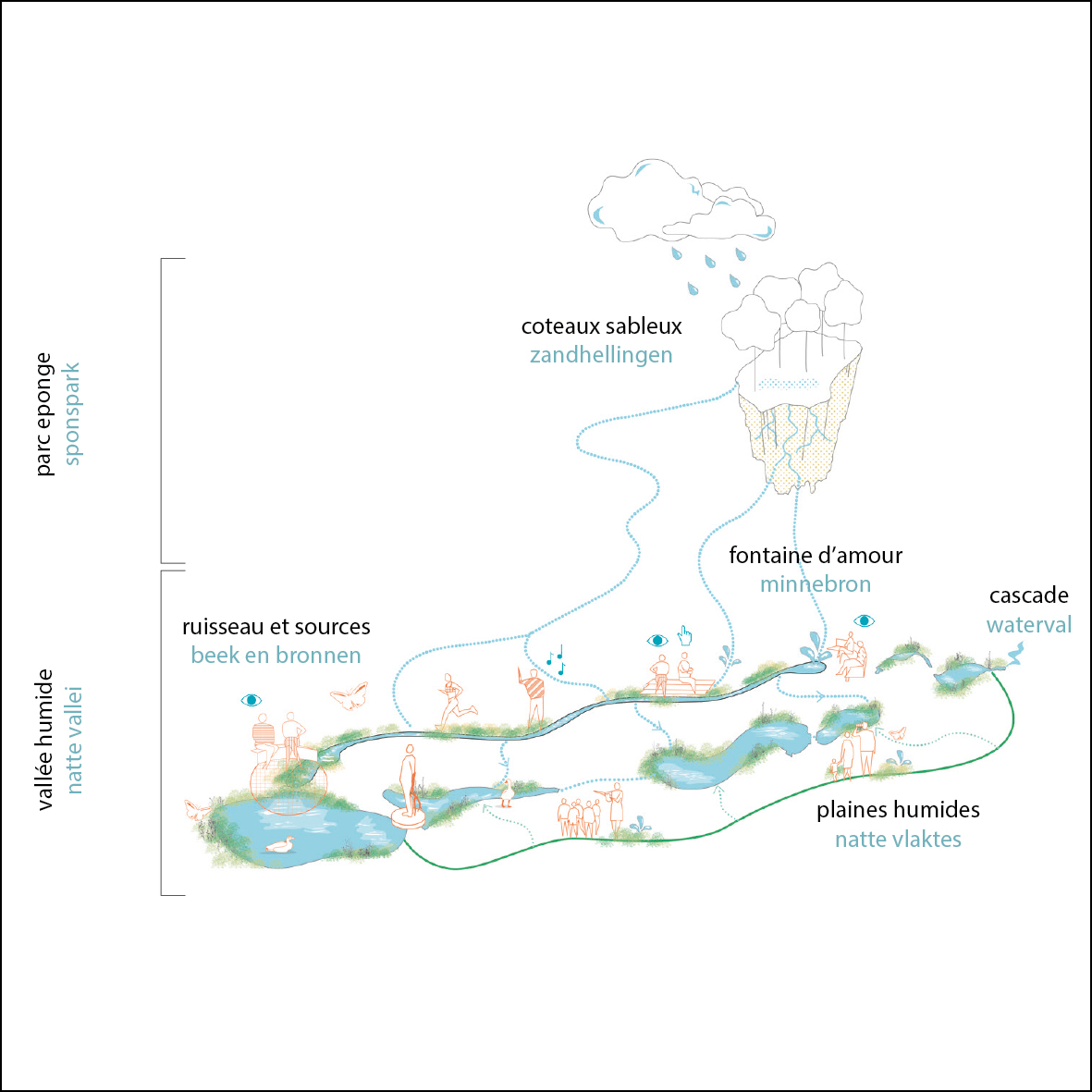 La place du Châtelain sera un des marqueurs de la transformation des espaces publics ixellois. L’évolution de l’espace modal, principal levier de transformation permet de stimuler l'affordance de cet espace public. Notre travail porte sur un double enjeu: permettre une réappropriation de la place par les usagers du quartier, en soutenant les déplacements actifs et les fonctions de séjour, et redonner de la place au vivant dans la ville.Notre proposition prend le parti d’une «place Canopée», où les nouveaux usages viennent s’abriter et se déployer sous le couvert et la protection des tilleuls majestueux de la place. Un mobilier XXL permet de créer un salon urbain unique, un espace de co existance entre humain et non humains dans la ville.