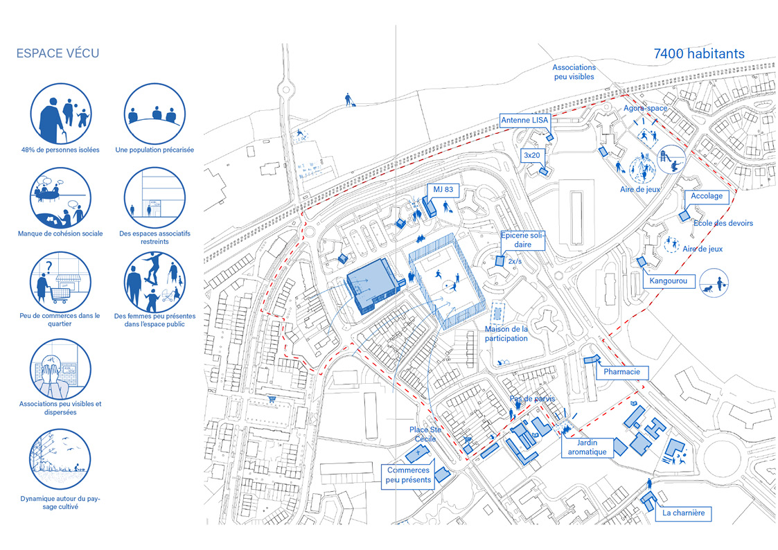 This program was developed through analyses, meetings, and exchanges. The aim was to understand and identify the site’s inherent qualities through three themes: the built environment, open space, and lived space The study defines spatial strategies designed to combine the different interventions in order to concentrate efforts and achieve a visible and effective revitalization of the neighborhood.