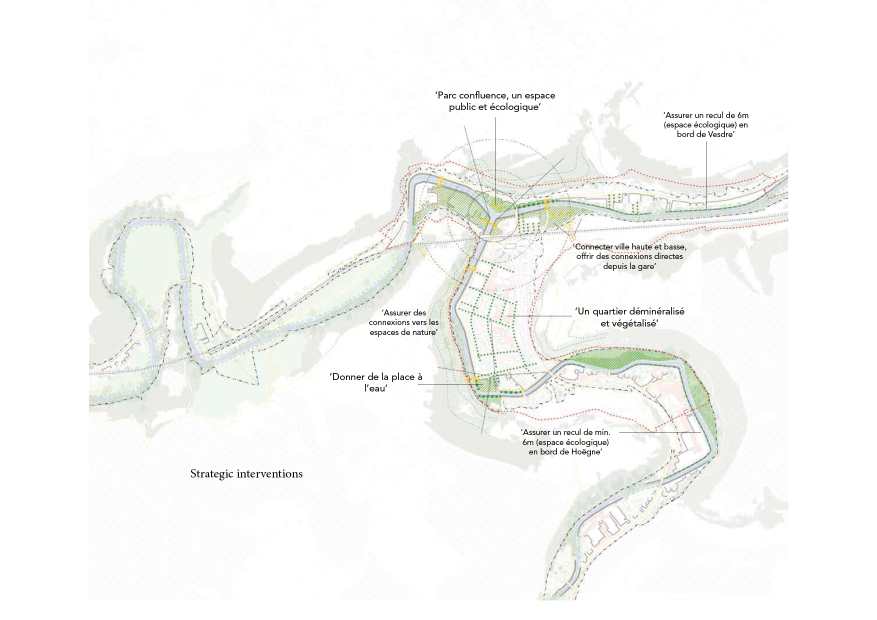 Suite aux inondations majeures de 2021 dans la vallée de la Vesdre, dans le sud de la Belgique, notre équipe multidisciplinaire a été nommée pour réévaluer les développements futurs dans 6 des villes les plus touchées. L'étude stratégique crée le cadre d'un développement résilient des vallées, avec l’espace de l’eau comme devise.